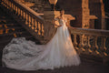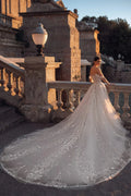 Vestido de noiva etéreo em corte A com renda floral 3D cintilante, lantejoulas brilhantes e saia de tule esvoaçante para um visual nupcial mágico