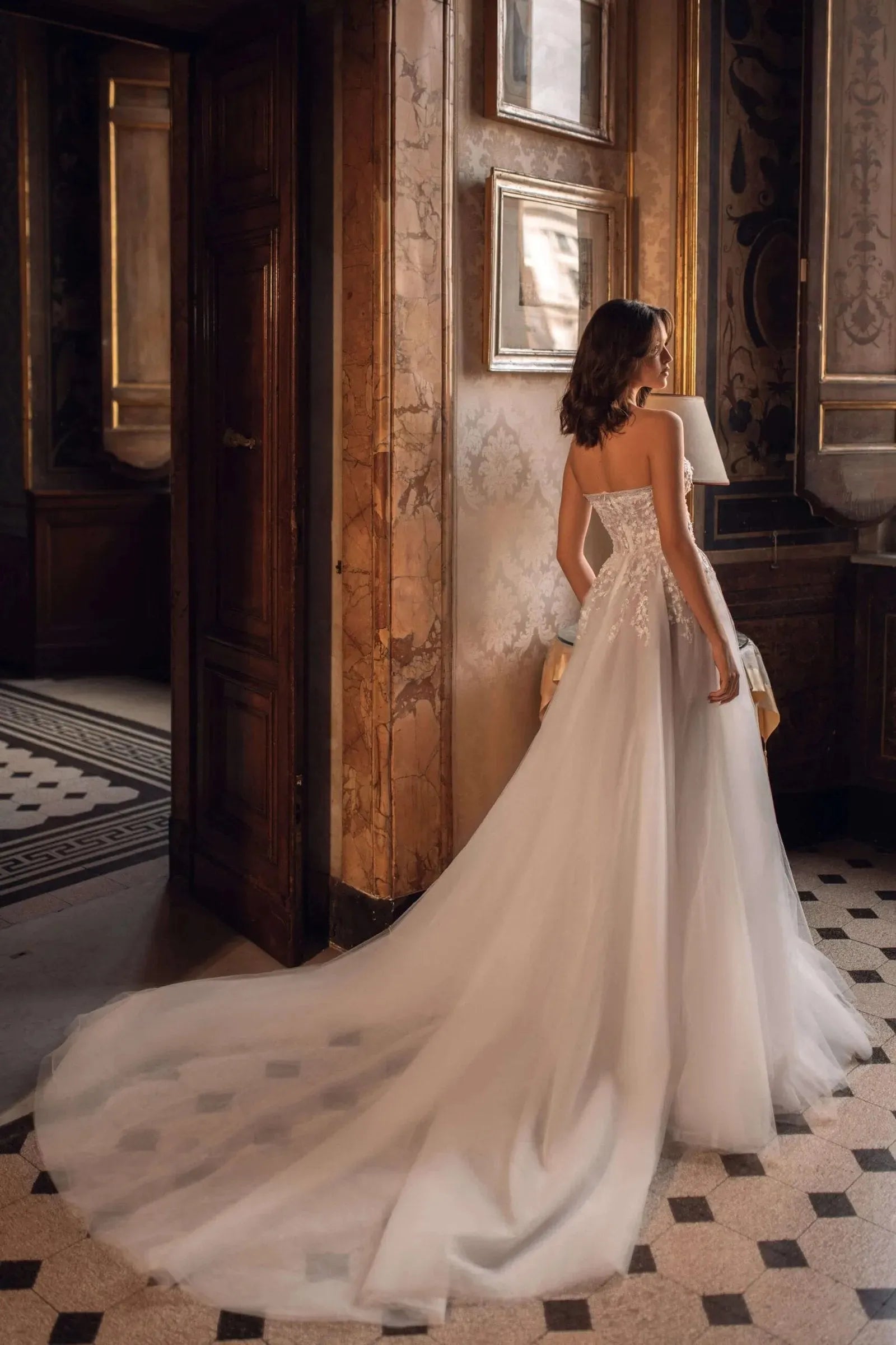 Vestido de noiva etéreo em corte A com tule delicado, renda intrincada, flores 3D e lantejoulas brilhantes para um visual nupcial romântico e glamoroso