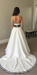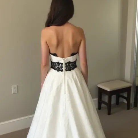 Regardless of the color you select for your dress, the white, black, or ivory lace accents will remain consistent. This applies to designs where the bodice and skirt are in different colors, maintaining a harmonious and sophisticated aesthetic.