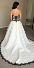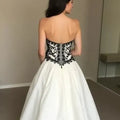 Regardless of the color you select for your dress, the white, black, or ivory lace accents will remain consistent. This applies to designs where the bodice and skirt are in different colors, maintaining a harmonious and sophisticated aesthetic.