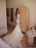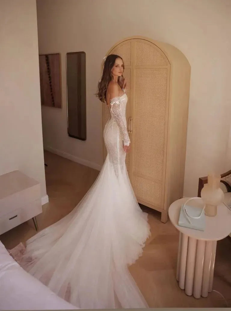 Vestido de noiva sofisticado estilo sereia com mangas ilusão, decote coração e detalhes requintados em renda – Vestido de noiva elegante