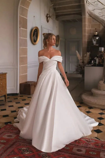 Vestidos de noiva de cetim princesa, uma linha, ombro de fora, vestido de noiva, pregas, vestidos de noiva