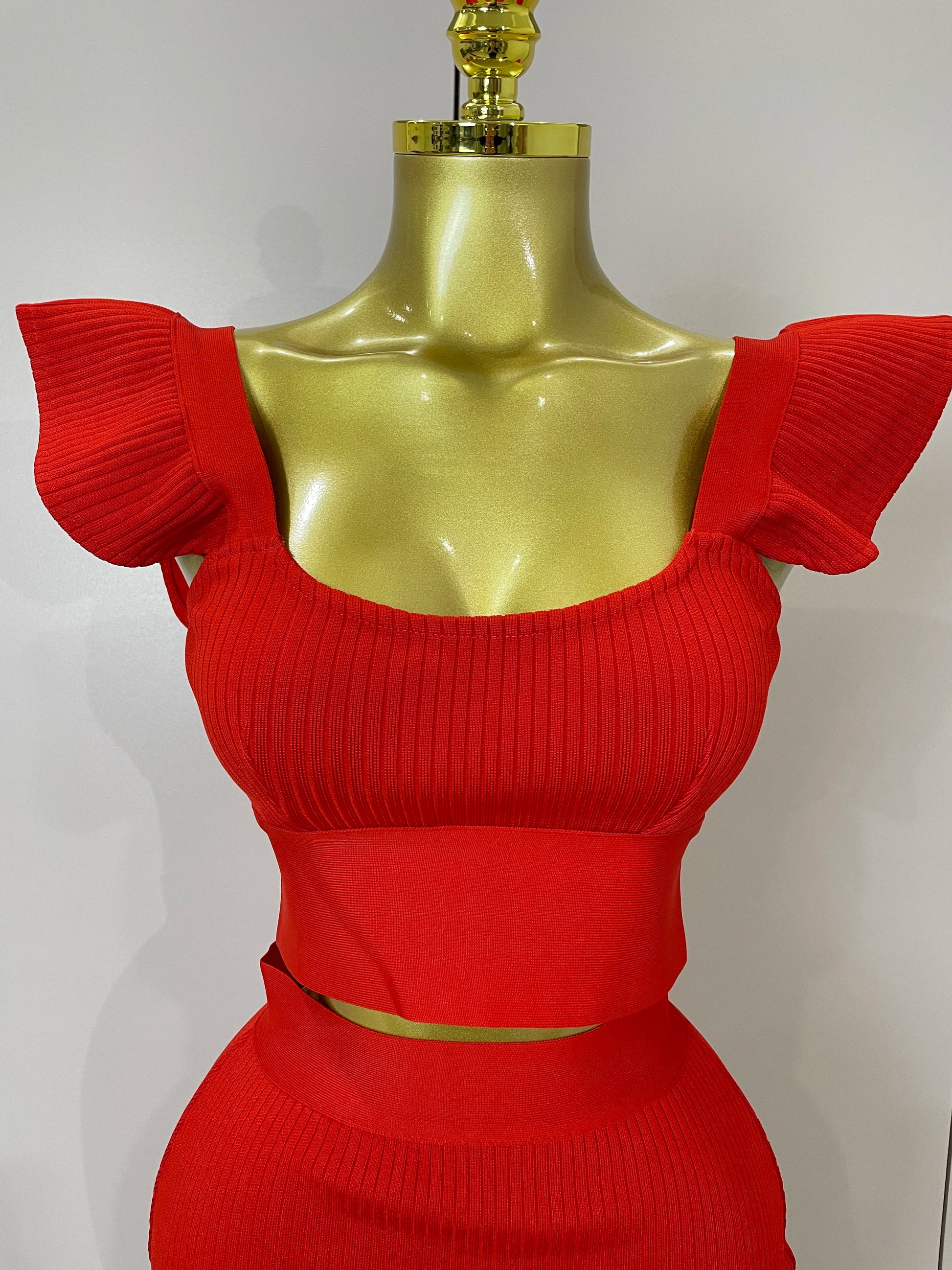 Women 2025 New Sexy Backless Ruffles Red Bandage Two Pices Set 2025 Celebrity Evening Elegance Birthday Party Dress