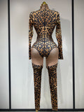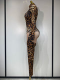 Women 2025 Stretch Leopard Print Sexy Bodycon Jumpsuit Bar Nightclub Singer Dancer Luxury Diamond Stage Performance Outfit