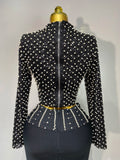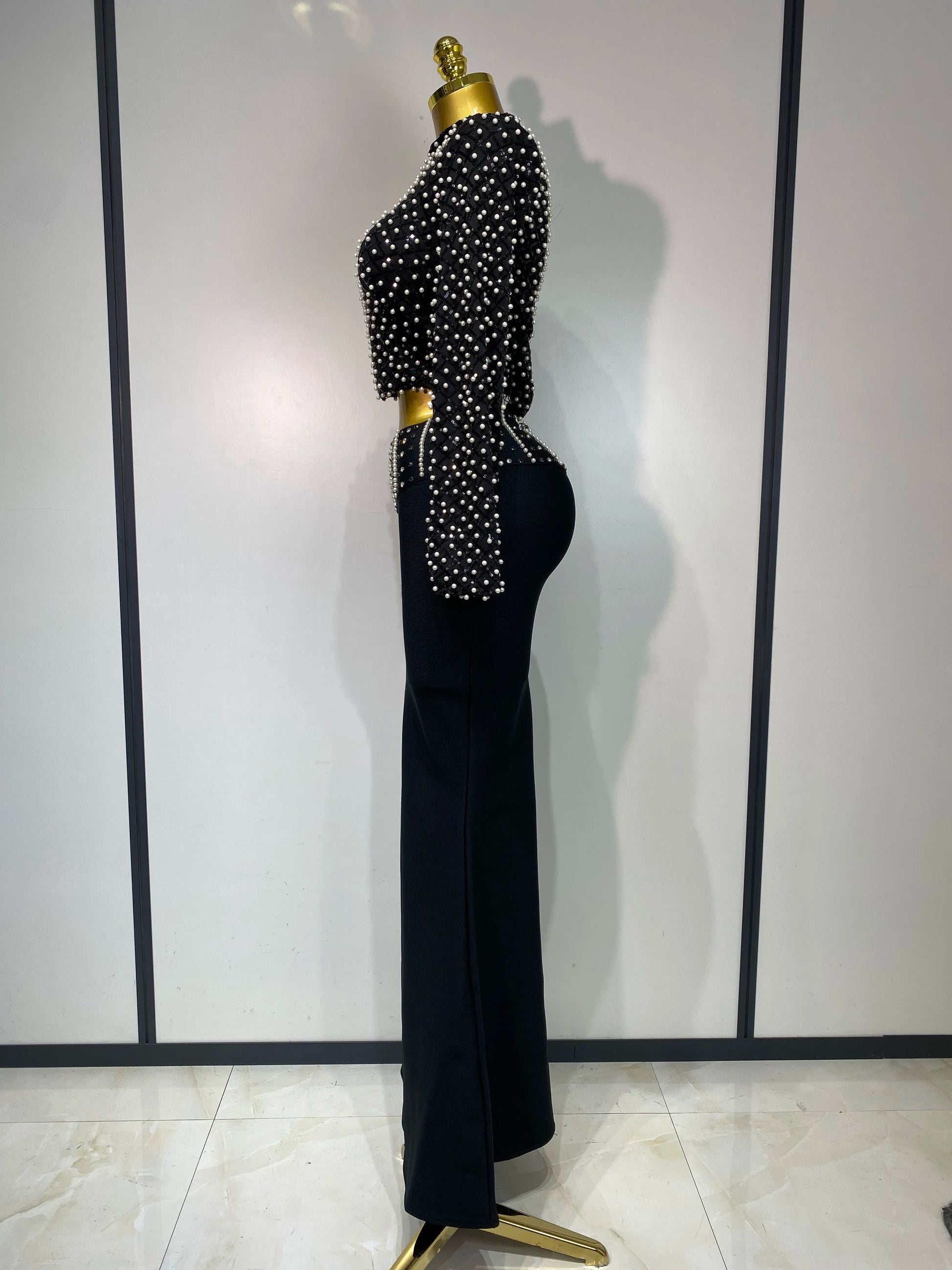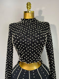 Women Long Sleeve Black Mesh Studded Dianonds Crystal Pearl Two Pieces Bandage Set Celebrity Sexy Evening Party Birthday Gown