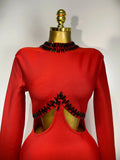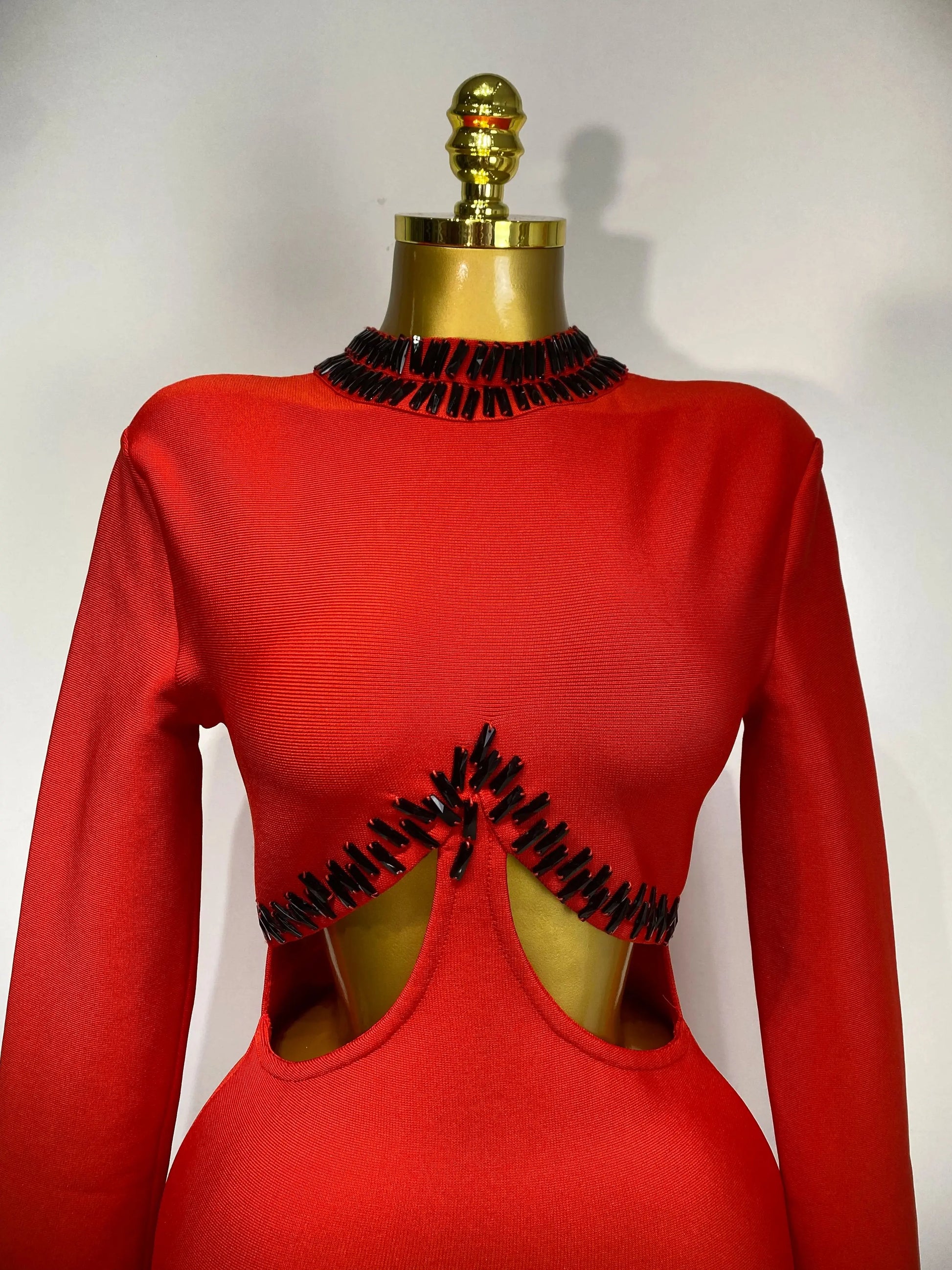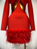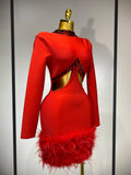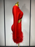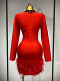 Women Sexy Cut Out Long Sleeve Beading Feather Red Mini Bandage Dress Celebrity Elegant Evening Party Luxury Birthday Dresses