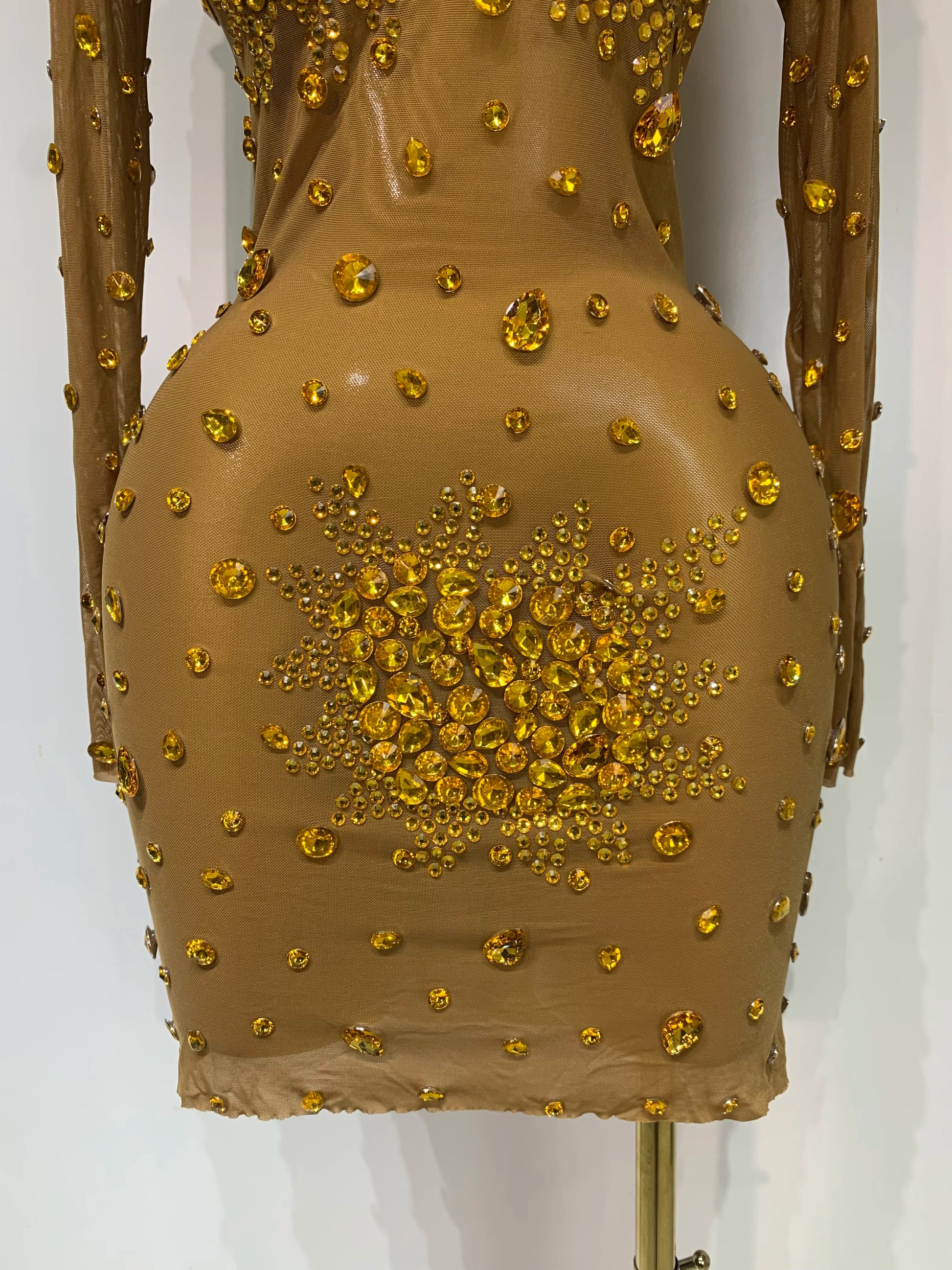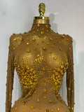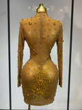 Women Sexy Gold Rhinestones Sparkly See Through Mini Dress Evening Party Fashion Performance Stage Outfit Luxury Birthday Dress