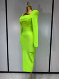 Women Sexy Long Sleeve Square Collar Fluorescent Green Midi Bodycon Bandage Dress 2025 Elegant Evening Birthday Party Dresses