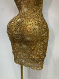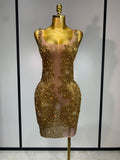 Women Sexy Stage Perform Outfit Club Gown Shining Gold Rhinestones Elegant Mesh Dress Birthday Evening Party Photoshoot Costume