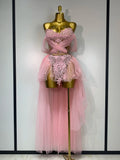 Women Sexy Strapless Pink Mesh Two Pieces Set Prom Gown Celebrate Birthday Nightclub Party Singer Stage Performance Costume