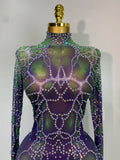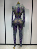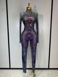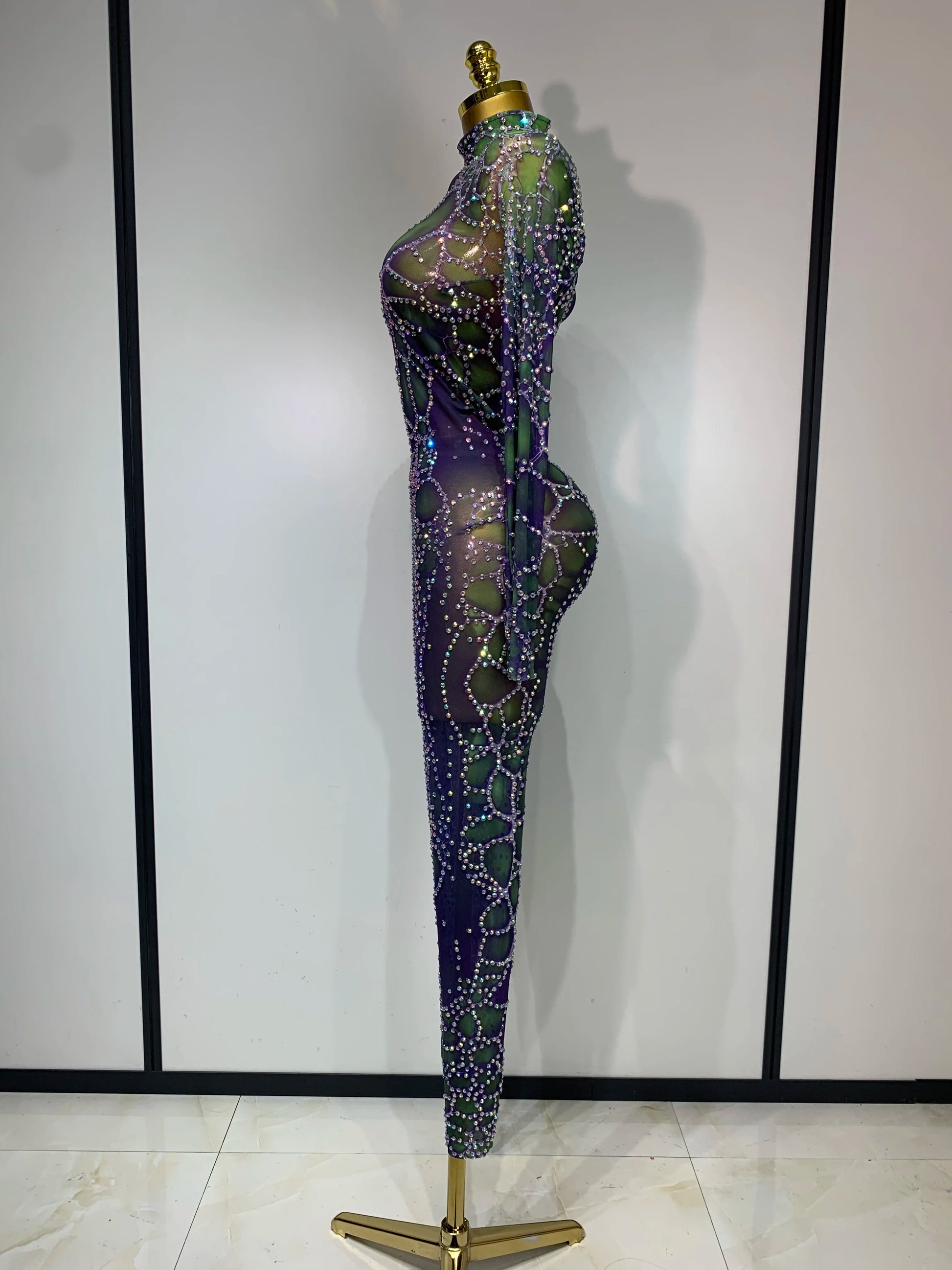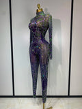 Women Sparkly Rhinestones Mesh Bodycon Jumpsuit Singer Stage Performance Dance Costume Nightclub Party Luxury Birthday Outfit