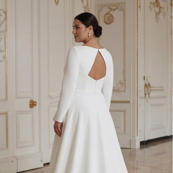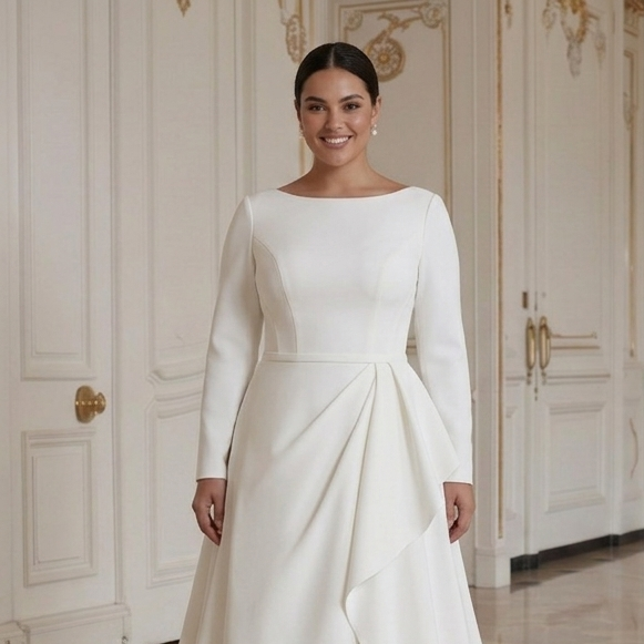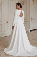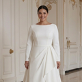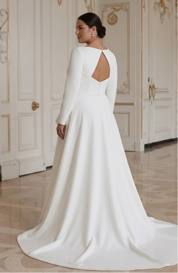 Rochie de mireasă modernă pentru mireasa cu forme, cu stil minimalist și șic