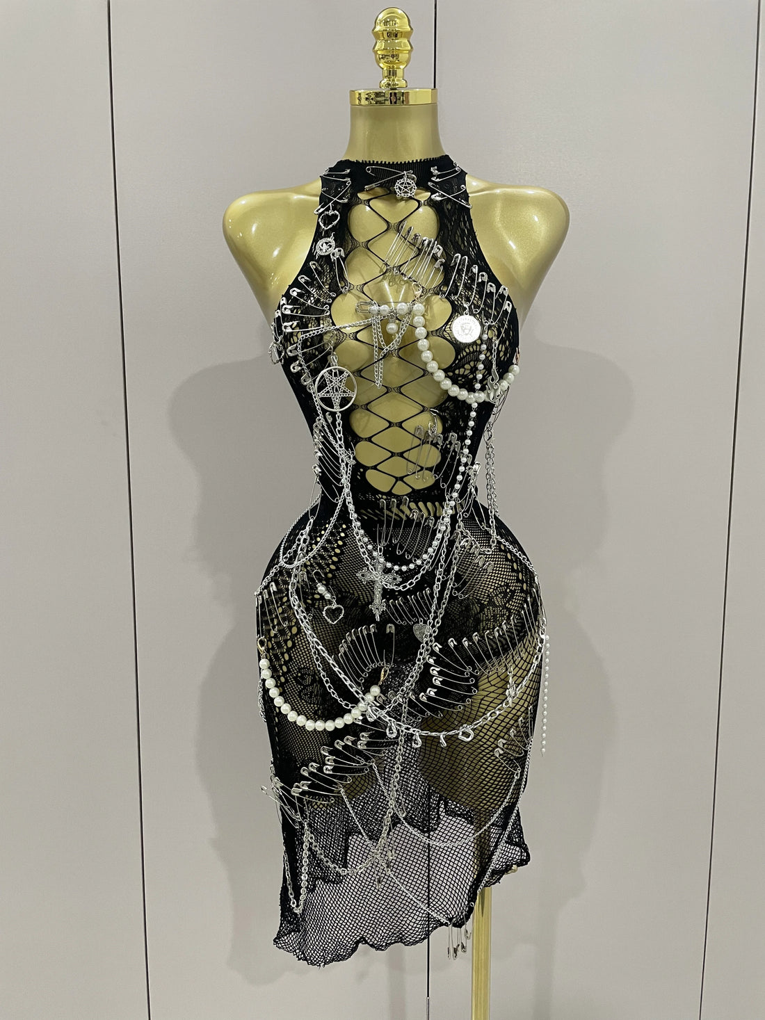Sexy Black See-Through Pin Decoration Chain Beading Short Dress 2025 Women Birthday Evening Party Nightclub Performance Costume