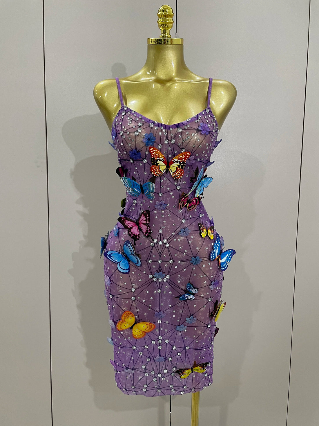 Women Celebrity Luxury Birthday Nightclub Stage Outfit 2025 Sparkly Butterfly Purple Sexy Mesh See Through Dress