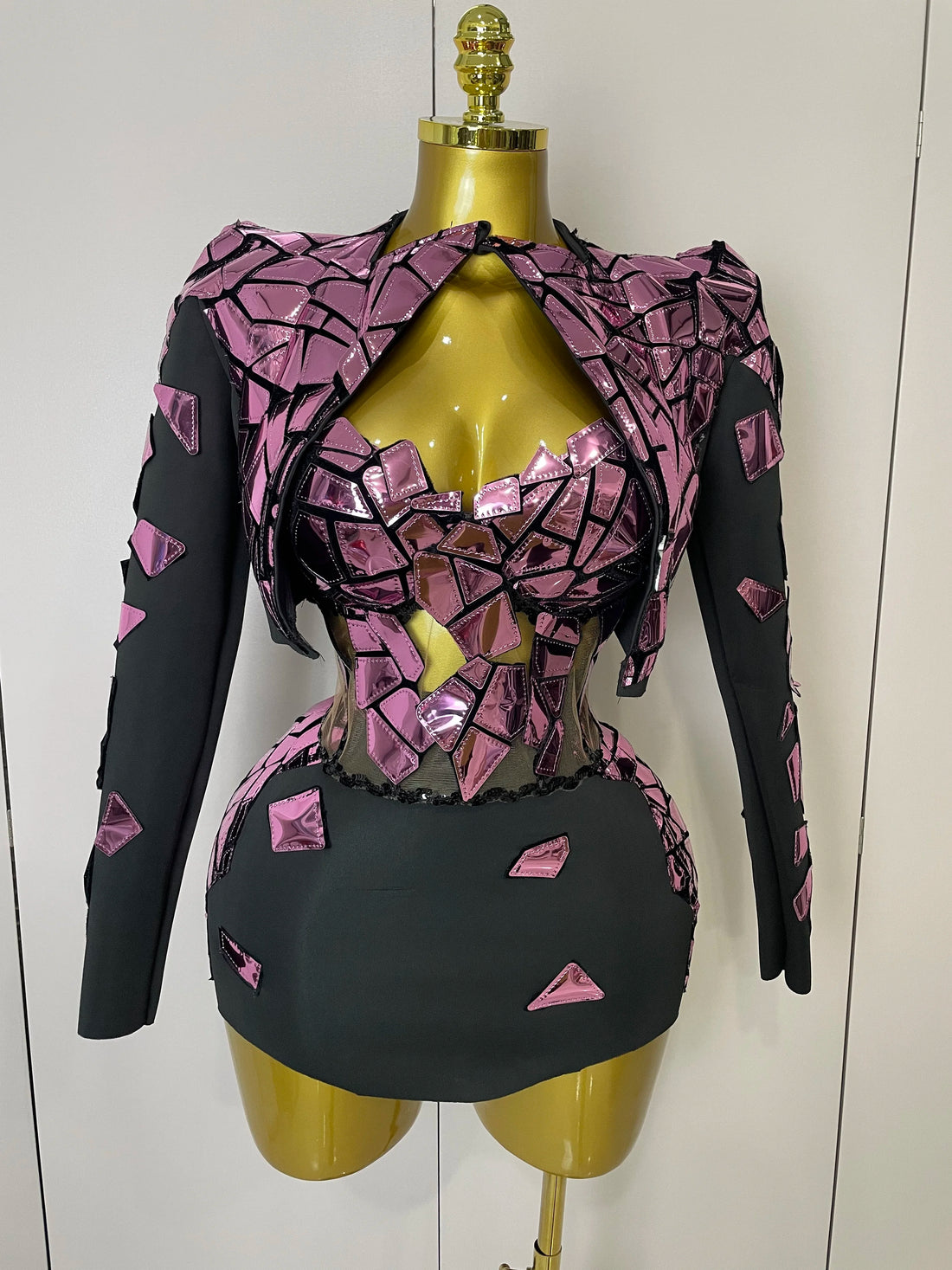 STOCK 2025 Women Sexy Pink Glitter Sequin Mirrors Short Skirt 3pcs Set Birthday Party Nightclub Queen Drag Stage Costume