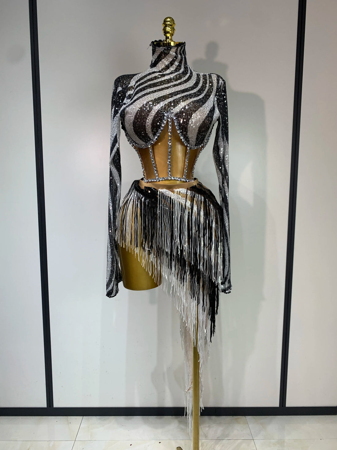 Sparkly Diamond Sequin Tassels Sexy Mesh Long Sleeved Two Piece Set Women Sexy Evening paty Birthday Nightclub Stage Costume