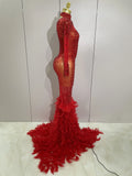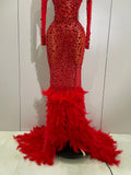 2025 New Sparkling Red Crystals Feathers Long Sleeve Mermaid Maxi Dress Women Wedding Celebrate Luxury Birthday Party Prom Gown