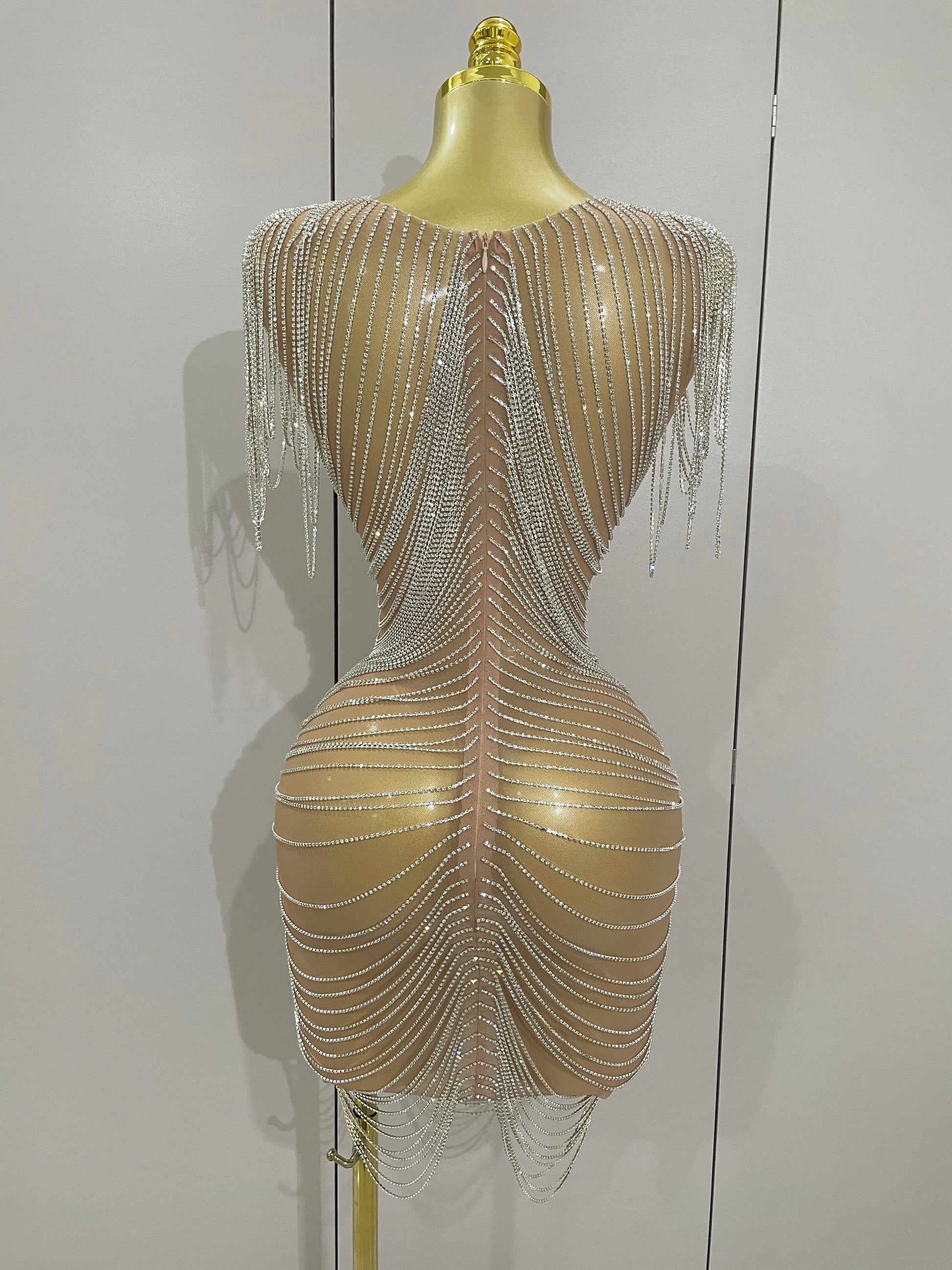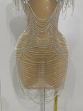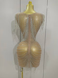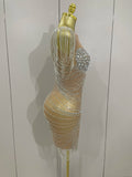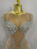 2025 New Sparkly Diamonds Crystal Sexy Mesh See Through Mini Dress Women Birthday Party Club Celebrate Stage Performance Costume
