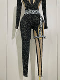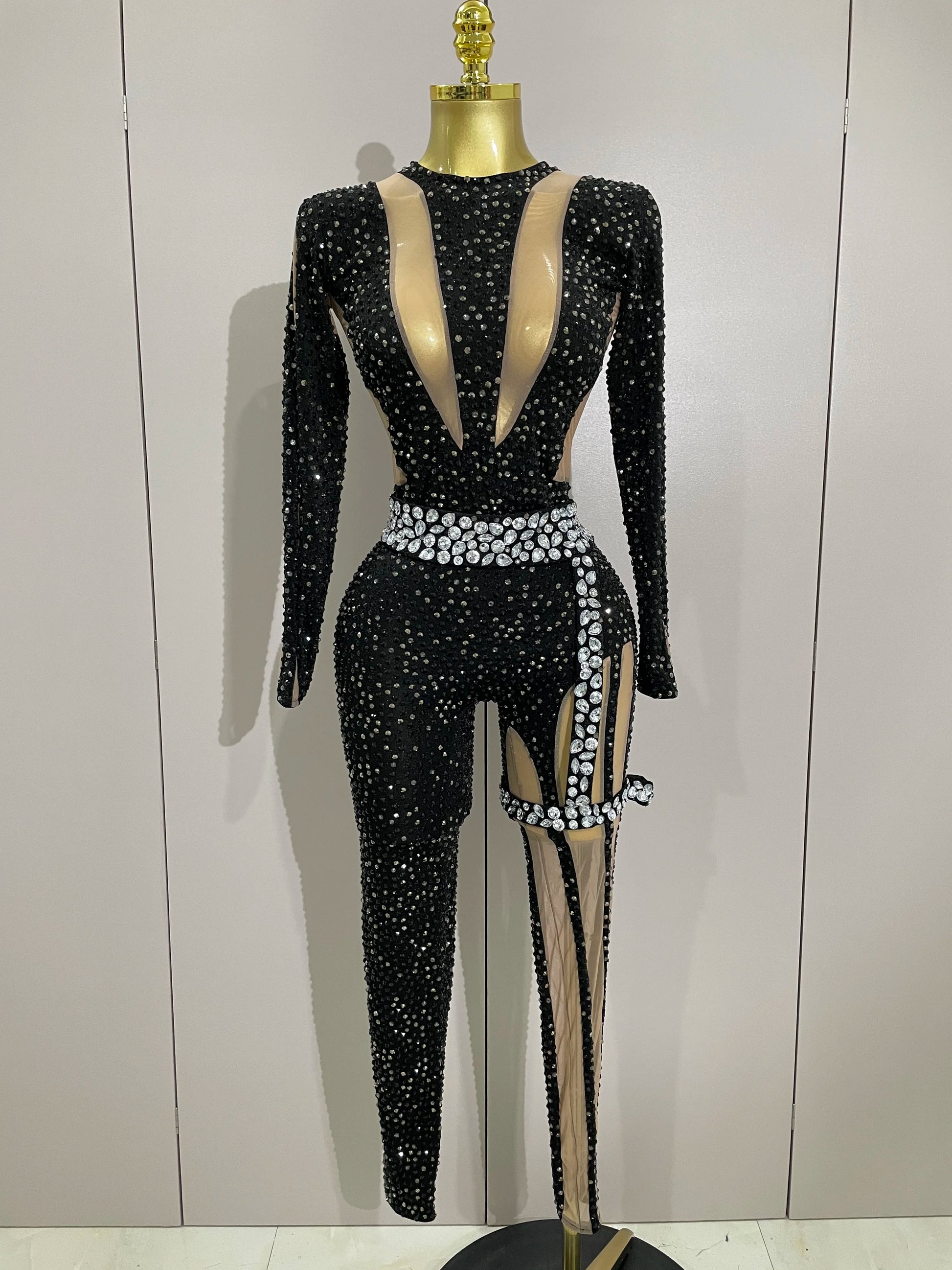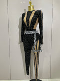 2025Sexy Sparkly Full Diamond Black Perspective Waist Cinching Asymmetrical Mesh Jumpsuit Birthday Party Nightclub Stage Costume
