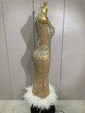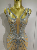Luxury Sexy Silver Rhinestone Mesh See Through Long Dress 2025 New Women Birthday Party Prom Gown Singer Nightclub Stage Costume