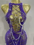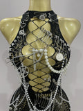 Sexy Black See-Through Pin Decoration Chain Beading Short Dress 2025 Women Birthday Evening Party Nightclub Performance Costume