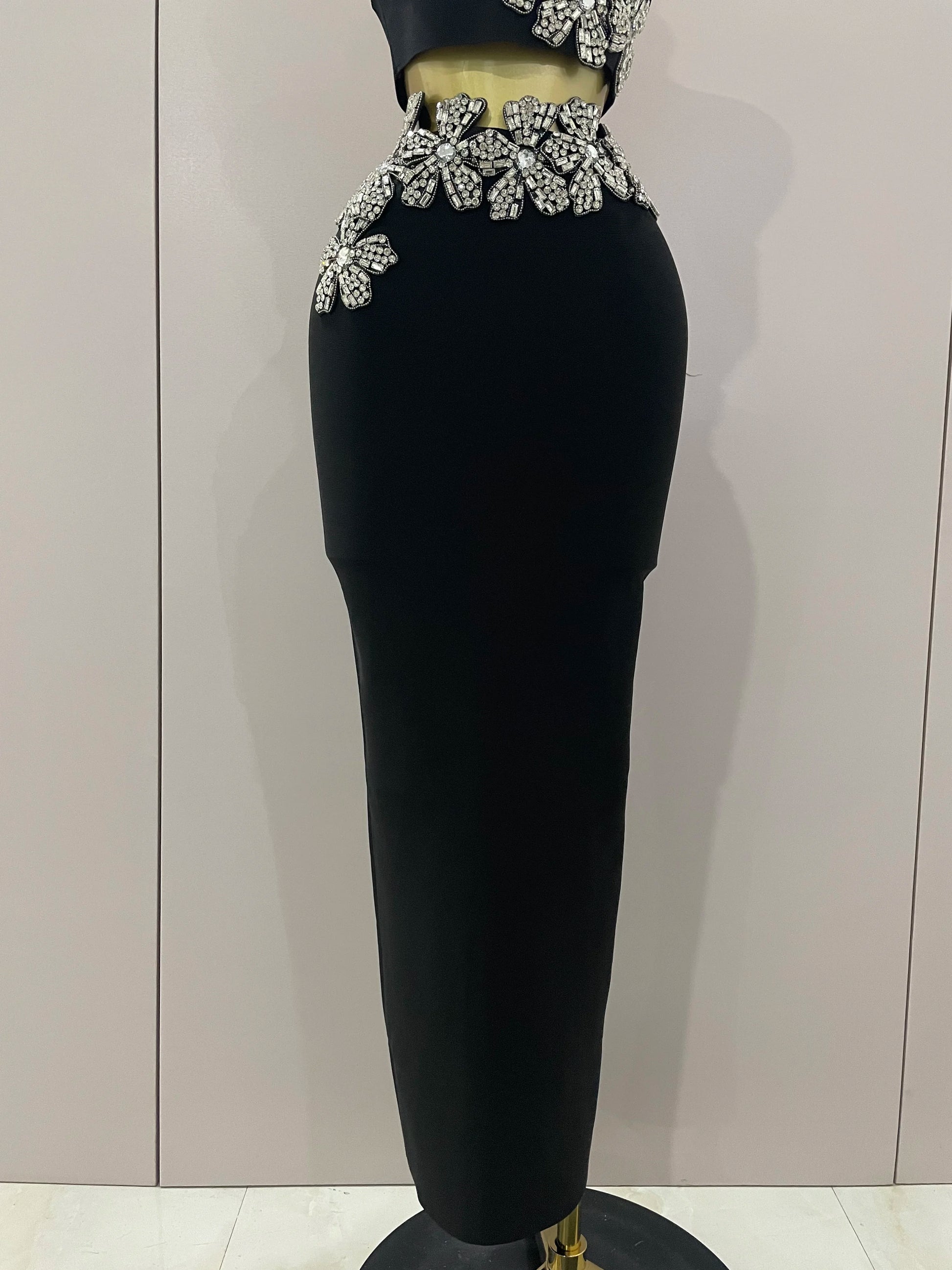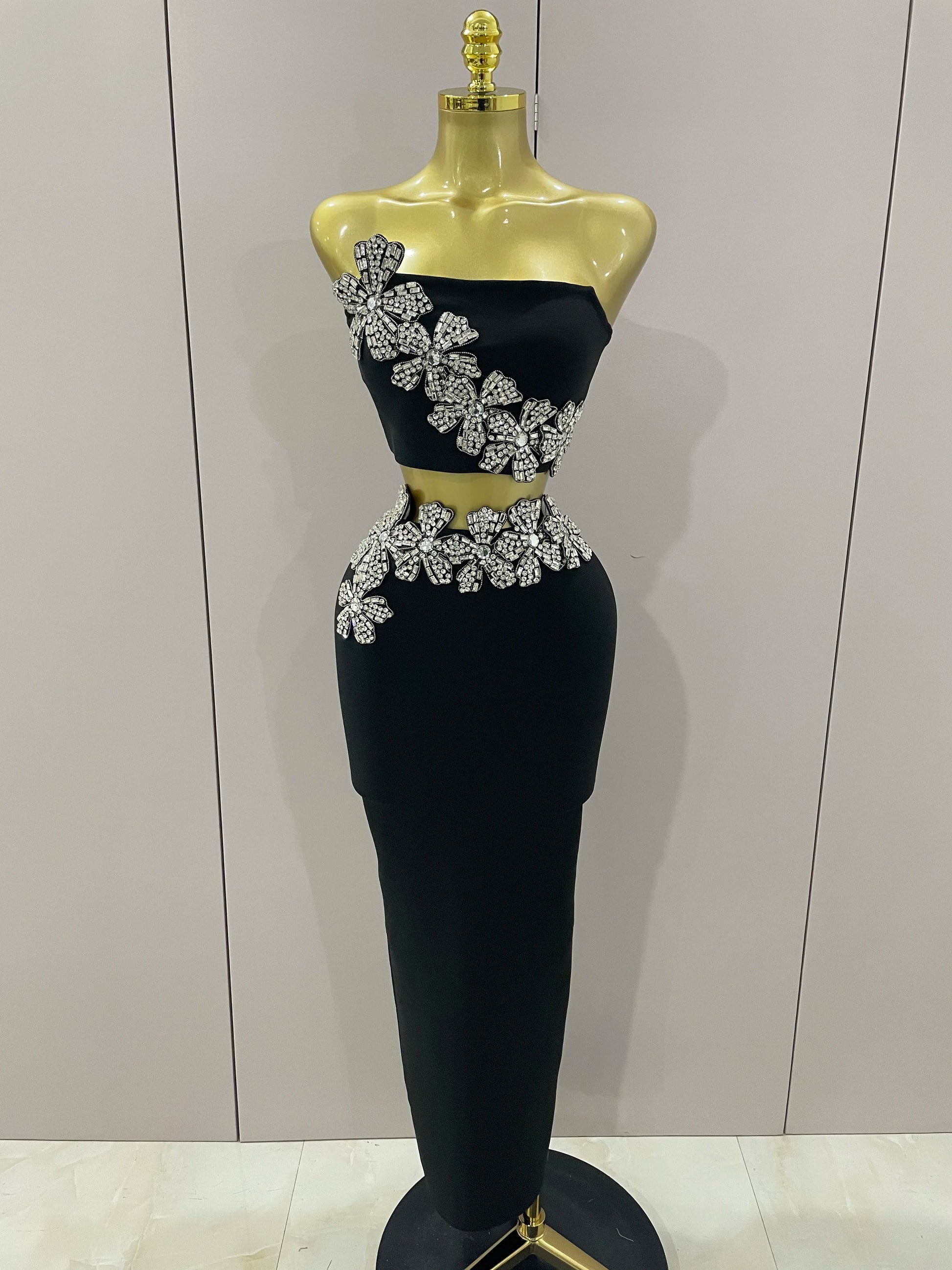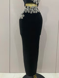 Sexy Strapless Flower Diamonds Black Maxi Long Bandage Two Piece Set 2025 Women Knitted Elegant Evening Club Party Prom Gowns