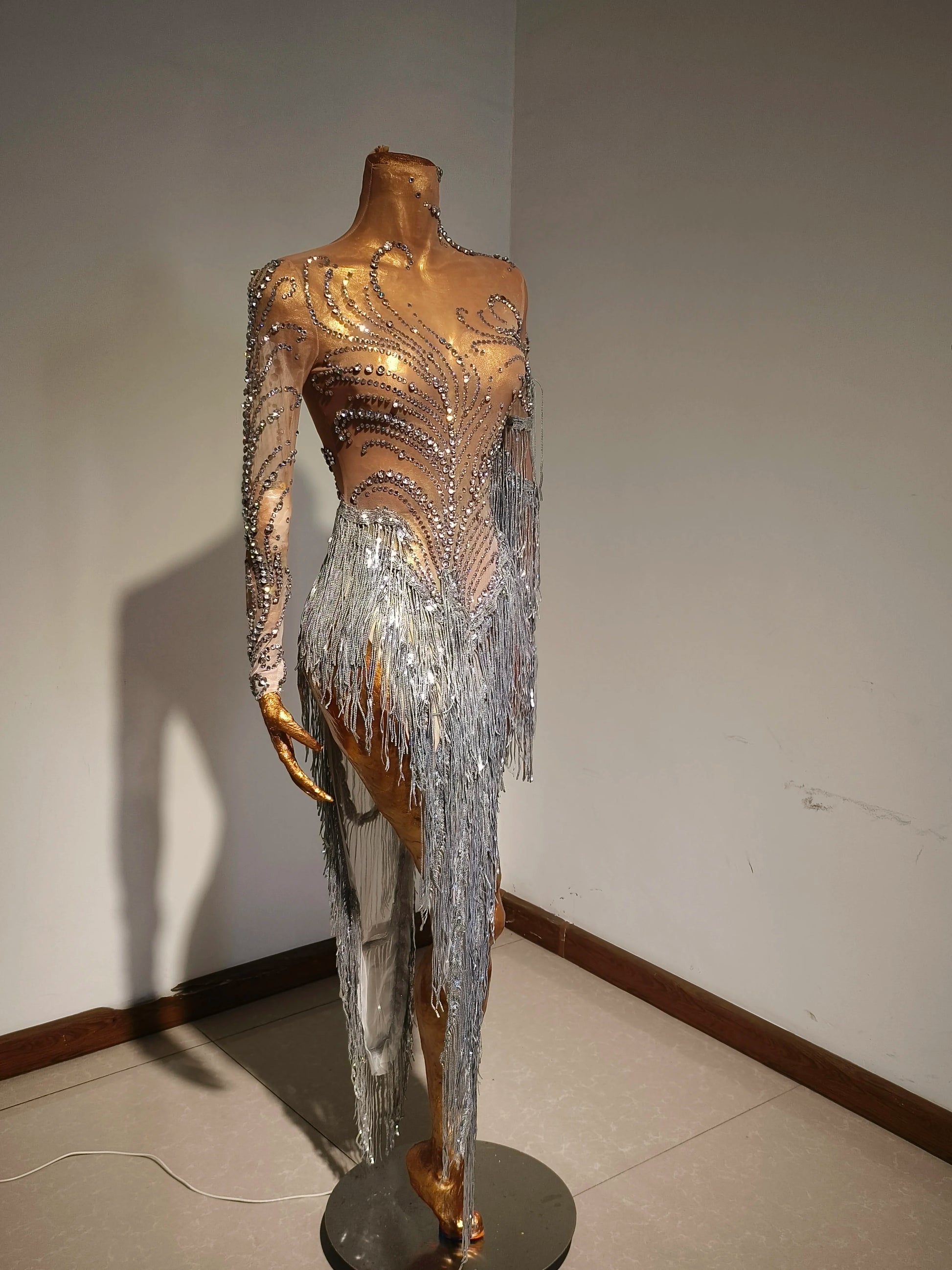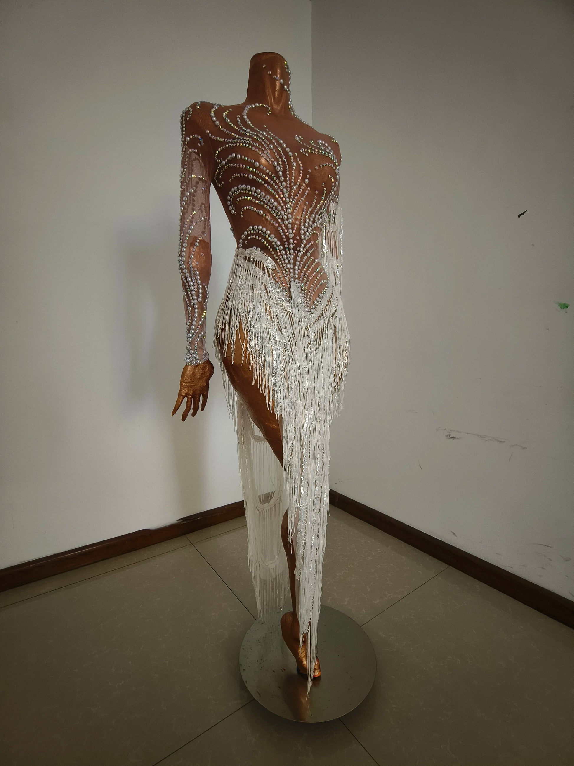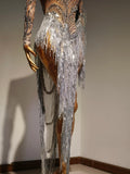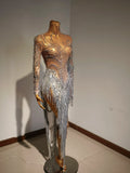 Sparkly Rhinestone Sequins Tassel Sexy Mesh See Through Dress Women Evening Birthday Party Nightclub Dance Singer Stage Outfit
