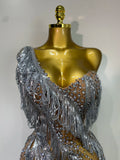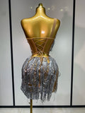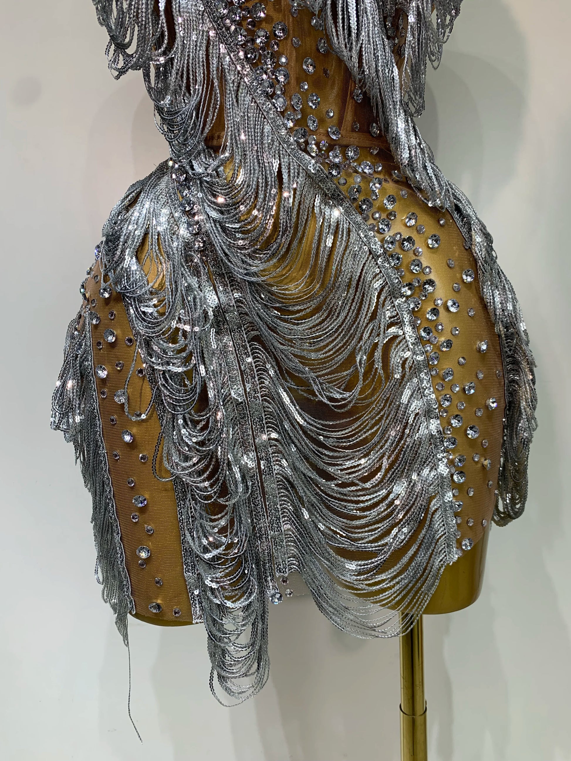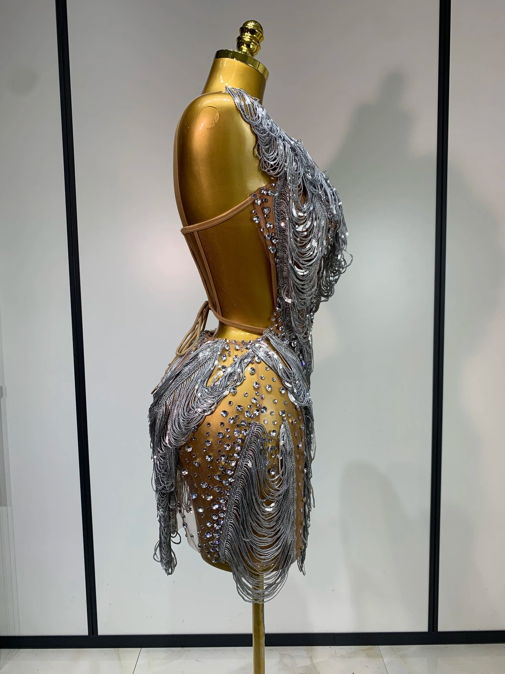 Sparkly Rhinestone Tassel Mesh Dress Nightclub Dance Stage Performance Costume Evening Party One shoulder Nigtclub Mini Dress