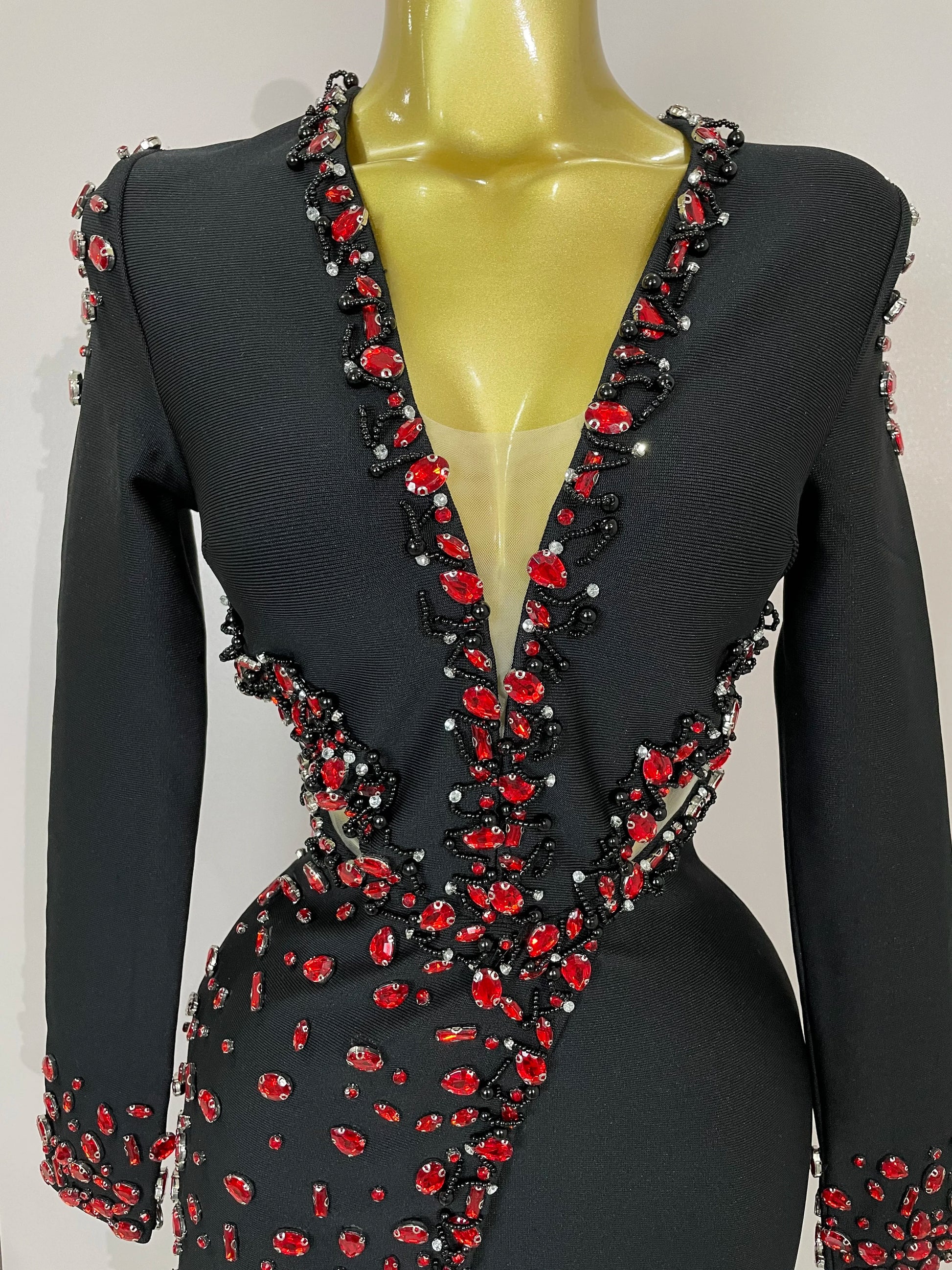 Women Celebrity Sexy Long Sleeve V Neck Rhinestone Black Bandage Dress 2025 Elegant Evening Club Luxury Birthday Party Dresses